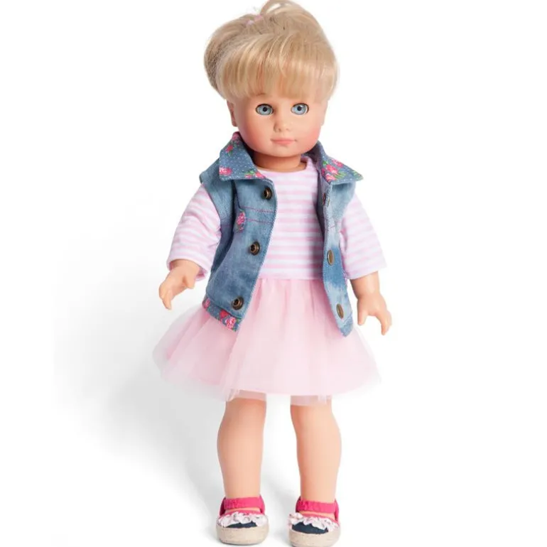 Flott antrekk som kombinerer søtt og tøft, med den søte tyllen i delikate pastellfarger sammen med den tøffe jeansvesten. Den rosa og hvite stripede trøyen i overdelen passer perfekt til det flerlags skjørtet av rosa tyll. Skjørtene og hjertedekoren laget av blomstermønstret jeans, gir den sportslige og avslappede jeansvesten et lekent utseende. Borrelåsen på kjolen samt knappelukkingene på jeansvesten gjør på- og avkledning enkel. Passer til alle dukker fra 28-35 cm. Dukke selges separat.