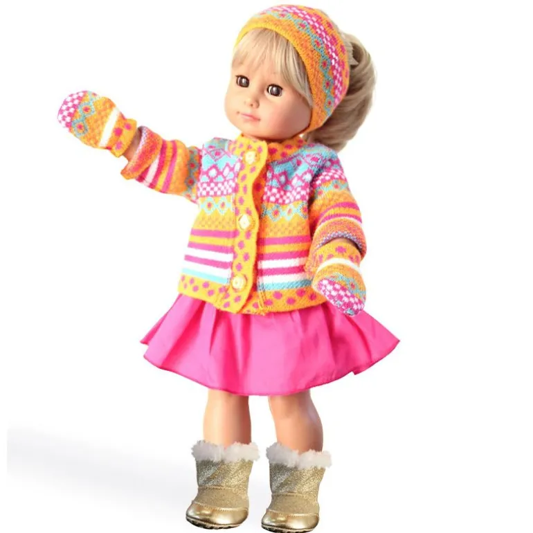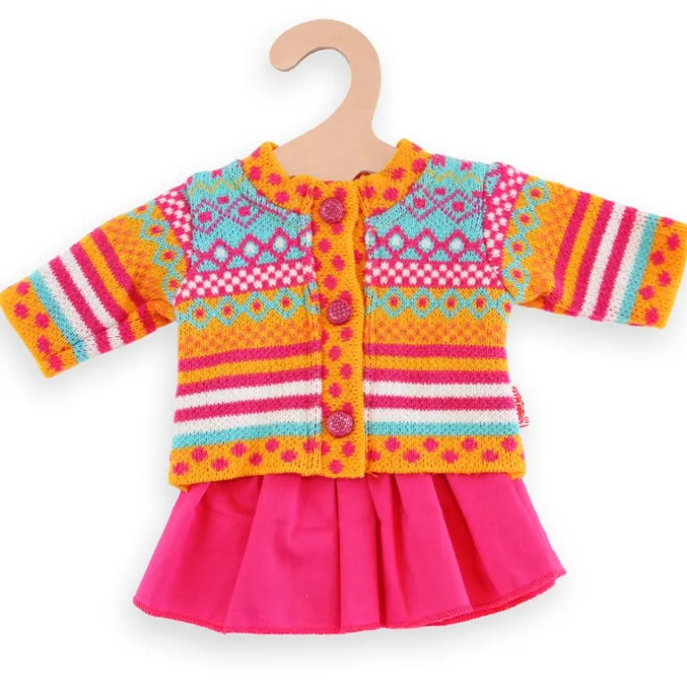 Flott og fargerik strikkegenser og rosa skjørt fra Heless. Genseren kommer med 3 knapper slik at den er enkel å ta på og av. Det følger med en kleshenger slik at du kan henge den opp når den ikke er i bruk.