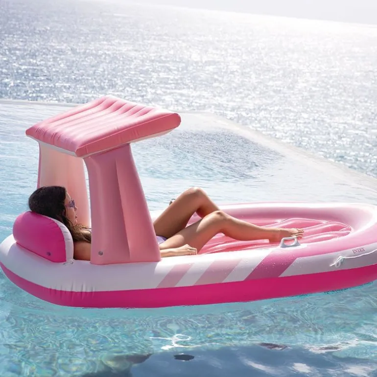 - Integrert oppblåsbar pute for komfort og et lite tak som skygger fol solen