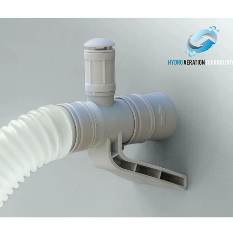 - Praktisk tappeplugg kobles til hageslangen slik at vannet kan dreneres bort fra bassenget eller huset