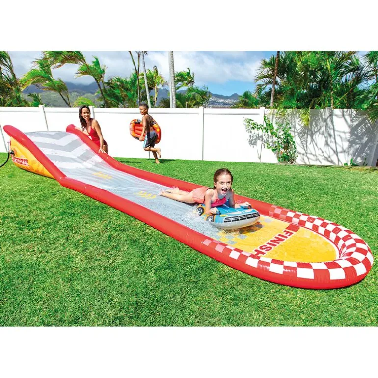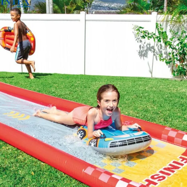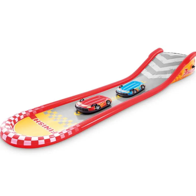 Klar, ferdig, gå! Barn vil elske denne stilige racerbane vannsklien fra Intex på varme sommerdager! Sett fart og skli mot mållinjen på den røde eller blå racerbilen. Med to racerbil surf riders badeleker kan barna konkurrere mot hverandre! Gode og solide håndtak gjør det trygt og morsomt å skli ned. Morsom og actionfylt utelek for barn fra 6 år på varme sommerdager!