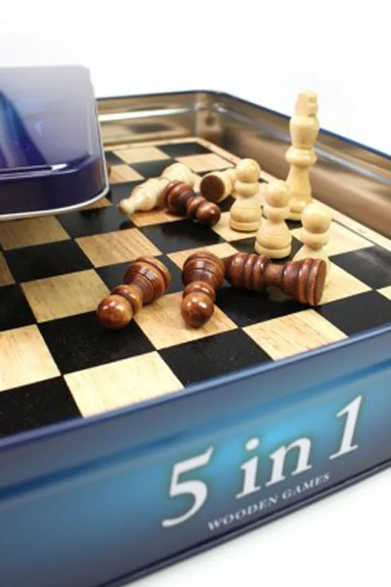 Flott eske i tin med 5 av de populære klassiske spillene; sjakk, backgammon, chechers, domino og Tic Tac Toe. Spillene kommer i en slitesterk eske i tin. Kommer med spillkomponenter av høy kvalitet og regler på norsk.