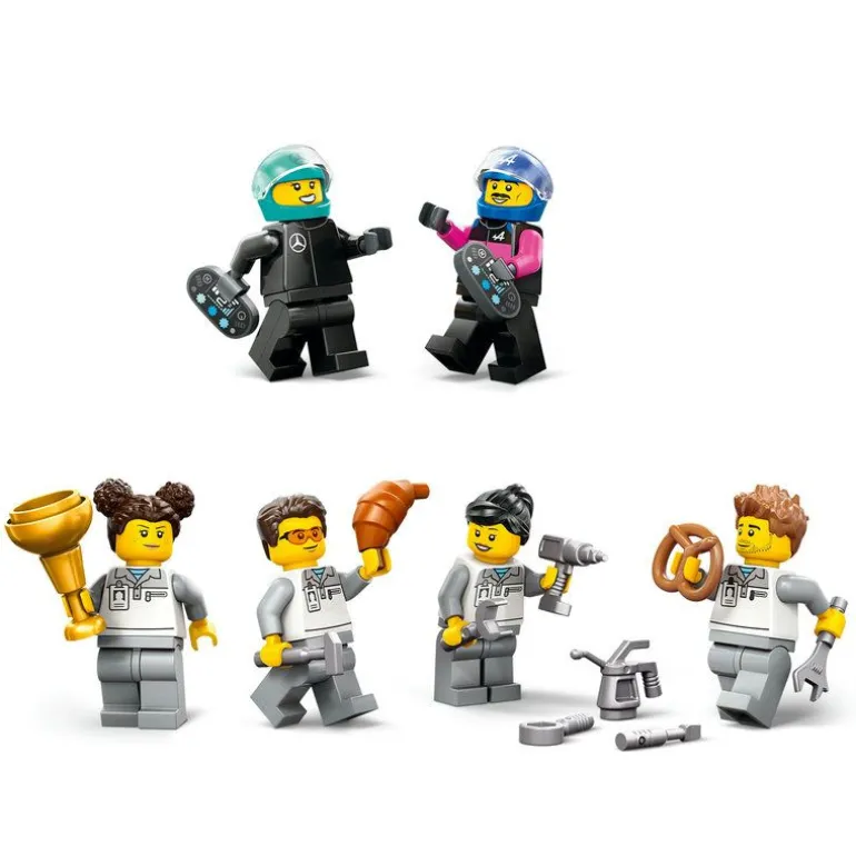 Velkommen til F1-verkstedet, hvor Mercedes-AMG- og Alpine-teamene gjør alt klart til neste løp! Sjekk ut de mønsterløse dekkene, kule arbeidsbenkene og verktøyvognene. Hjelp mekanikerne med å finjustere racerbilene før du fester sikkerhetsbeltet og gjør deg klar til å suse ut av startbåsen. Hvem tar hjem pokalen? Gjør deg klar for spennende F1®-action i LEGO City!