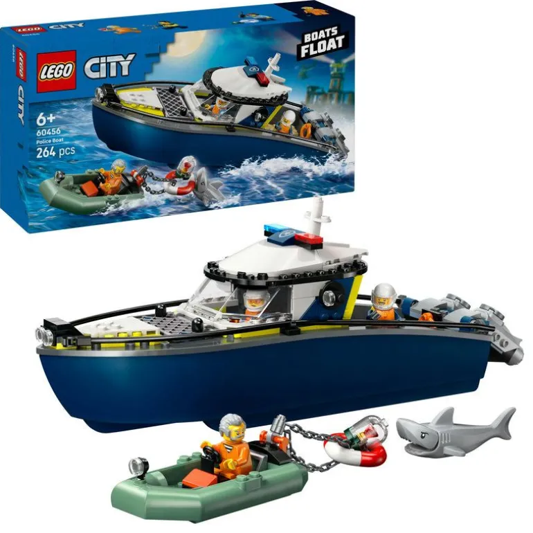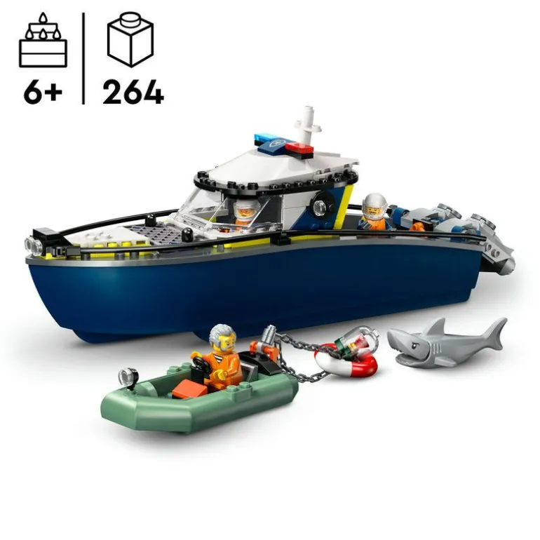 - Inneholder en politibåt, en motorjolle, tre minifigurer og en haifigur
