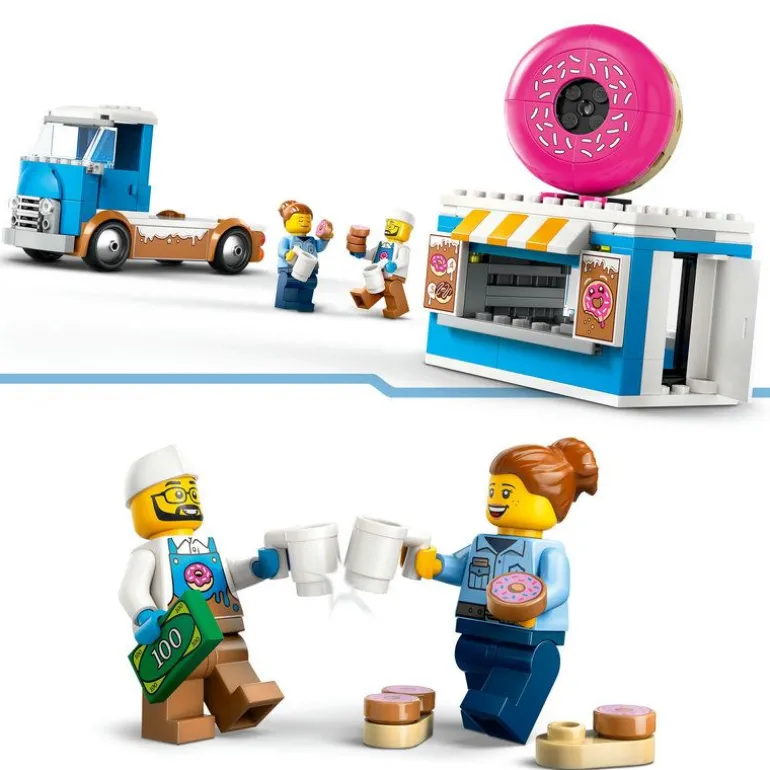 Kjør ut smultringbilen, og sett kursen for LEGO City! Denne kule varebilen har en avtakbar salgskiosk! Se de fine glasurmønstrene og den store smultringen på taket. Finn på velsmakende oppskrifter på kjøkkenområdet, og server nystekte smultringer og deilig varme drikker til sultne kunder. Når du er klar til å kjøre videre, kan du sette deg bak rattet og kjøre den mobile kafeen din til neste sted!