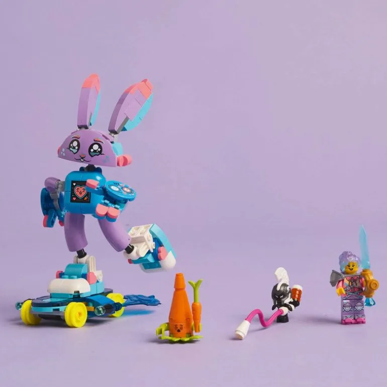 Kast deg ut i nye eventyr med Izzie og Bunchurro med dette superspennende LEGO DREAMZzz byggesettet. En kyberling med et juicer-våpen tapper en drømlinggulrot, og Izzie trenger din hjelp for å redde ham! Bygg en tøff kaninfigur av Bunchurro, og utstyr ham med et skateboard og boostere for fartsfylte eventyr, eller med en kul jetpack. Kom igjen!