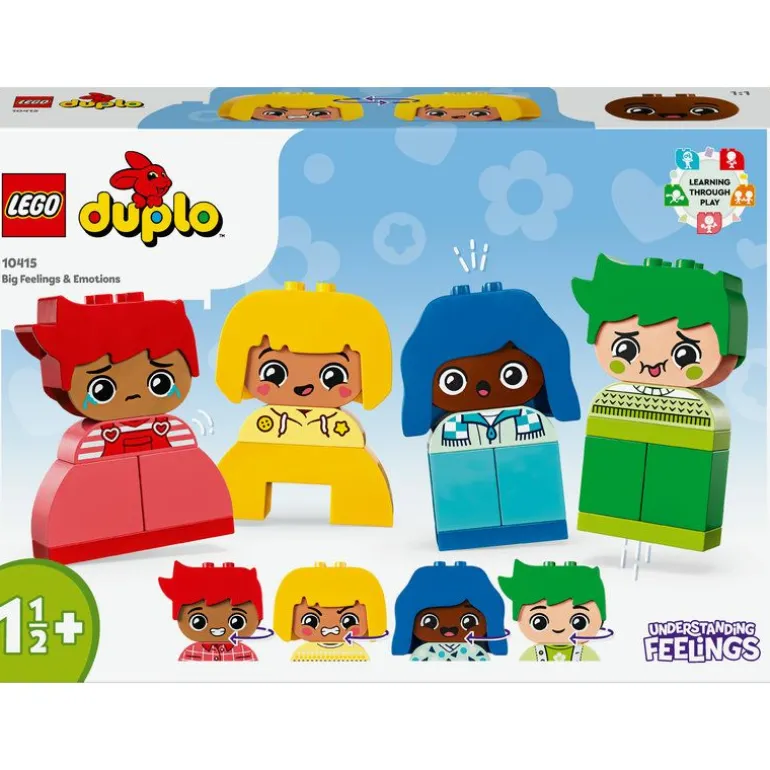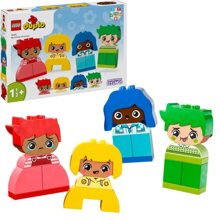 Med settet LEGO DUPLO Mine første sterke følelser kan du gi barn gøyal lek og muligheten til å uttrykke hva de føler. Settet er designet for å utvikle førskolebarns selvbevissthet, og alle de fire figurene har to ansiktsuttrykk – smilende og misfornøyd – som gir voksne og barn muligheten til å snakke om de sterke følelsene vi alle har iblant.
