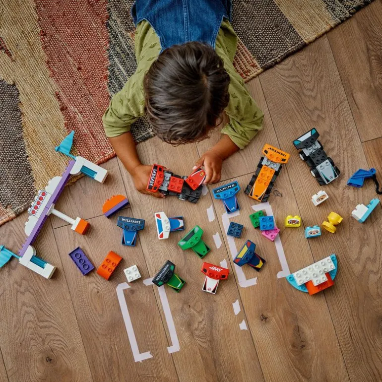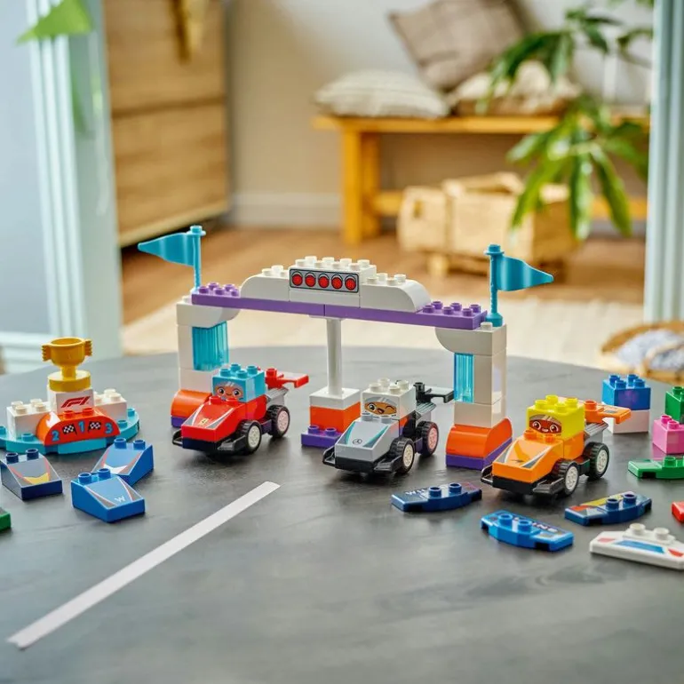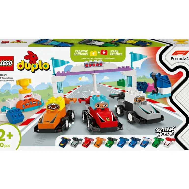 Introduser smårollingen din for Formel 1-universet med dette funksjonsrike LEGO DUPLO byggesettet. Gjør dere klare for spennende rollelek, hvor du og barnet ditt kjører om kapp med hverandre. Barn kan tilpasse bilene til hvert F1-team før de bestemmer hvilken sjåfør som skal krysse målstreken først og motta pokalen på seierspallen. 5, 4, 3, 2, 1 … kjør!