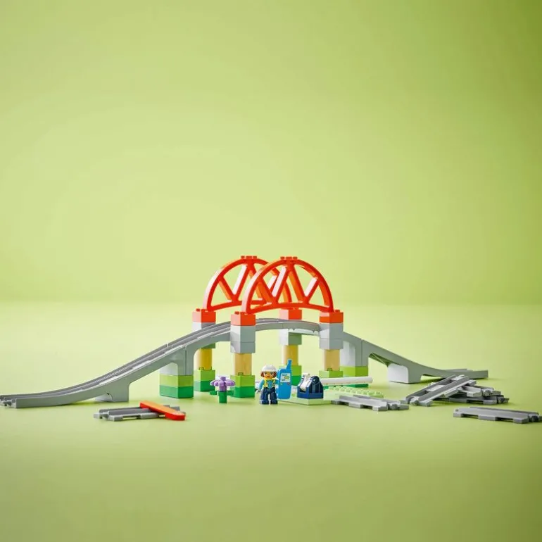 Få fart på småbarns læring med dette skinneutvidelsessettet. Settet inkluderer en byggbar bro og åtte rette skinner som sender førskolebarns LEGO DUPLO tog ut på helt nye eventyr. Settet inkluderer også et bom-element som små barn kan heve og senke, samt en figur av en jernbanearbeider med mobiltelefon. Funksjonsklossen gir realistisk lek og får toget til å stoppe og spille av lyder.