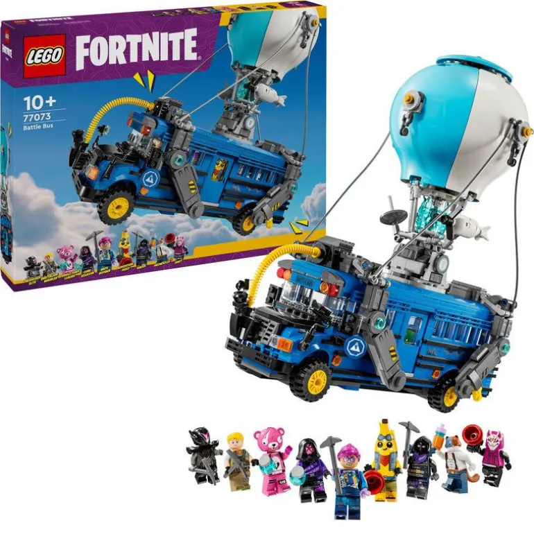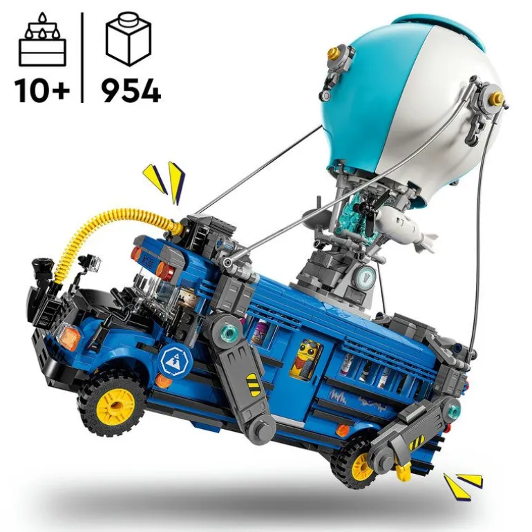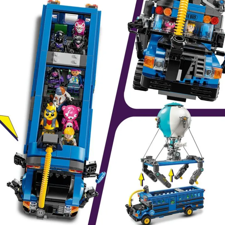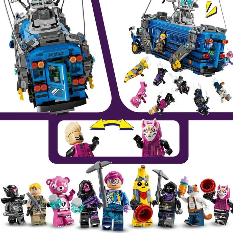 Vil du oppleve eventyrlige LEGO Fortnite? Du får en gøyal byggeopplevelse før du legger ut på landeveien med Battle Bus! Modellen er inspirert av bussen fra videospillet og har roterende hjul, avtakbart tak og et tøft varmluftballong-element! Bussen er full av spennende detaljer, og inni finner du både Slurp Juice, Grappler, Pickaxes og Slap Juice samt ni minifigurer fra favorittspillet ditt!