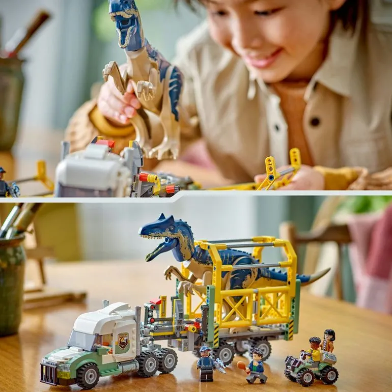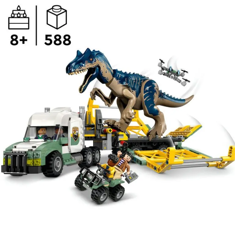 - Settet består av 588 deler og inkluderer trailer med bur og allosaurus som er 43 cm lang