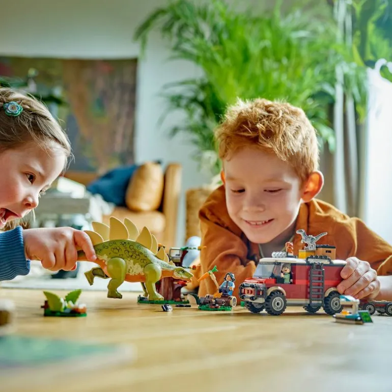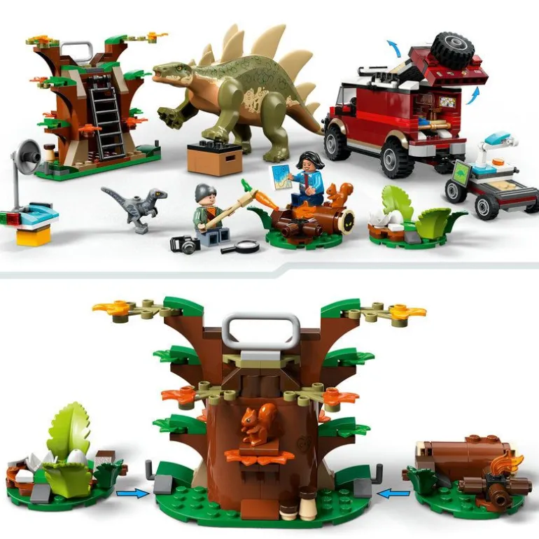 Spor opp den mektige stegosaurusen sammen med Sammy og Ben! Koble til hengeren, og stig om bord i terrengkjøretøyet for å lete etter den gigantiske planteeteren. Bruk stigen for å klatre opp i utkikkstreet og prøve å få øye på dinosauren. Hva ser du i buskene? Det er stegosaurusen! Se om den vil ha gulroten, men vær forsiktig. For en dag! Få deg litt hvile, så du er klar for morgendagens eventyr.