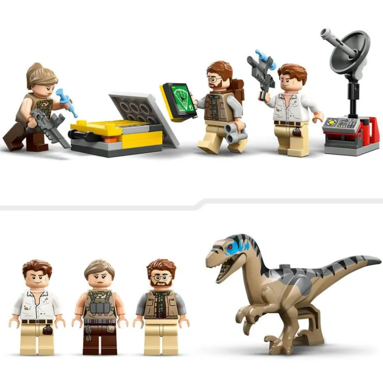- To dinosaurer – støpte figurer av en titanosaurus og en velociraptor samt tre minifigurer