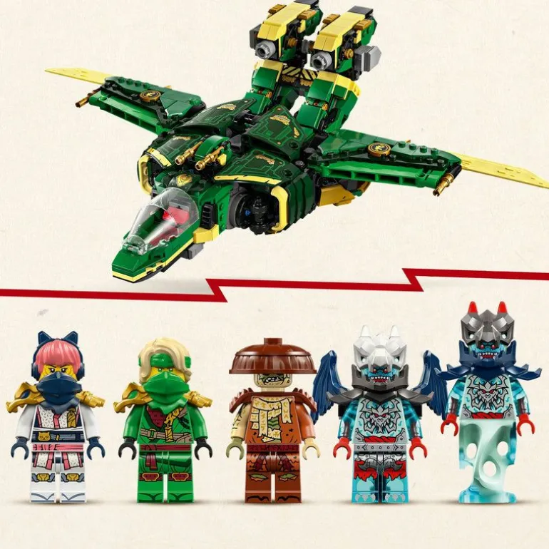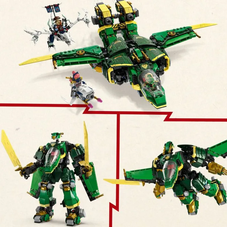Gjør deg klar for episke kamper med Lloyds jagerrobot. Sett den i robotmodus for å slåss på bakken med to store sverd, og forvandle den etterpå til jagermodus for å fly av sted! Du må bekjempe Kur, Forråtnelsens mester, Tyr og en spektraldragonkriger. Sora kan angripe dem på sin flygende motorsykkel – men se opp for skurketrioens farlige spektraldrage. La oss føre ninjaene til seier!