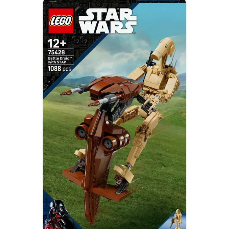 - En LEGO figur av en kampdroide i standardstørrelse, STAP-speeder og en faktaplate