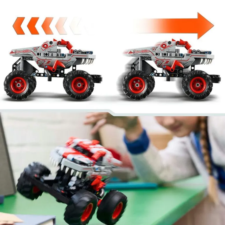 Den har pigger! Den har skjell! Den vet å bite fra seg! Ta vel imot den enestående ThunderROARus! Denne monstertrucken kombinerer avansert robotteknologi med dinosaurens voldsomme krefter, og den er klar for action. Trekk monstertrucken bakover for å sende den av gårde i full fart. Utfør imponerende stunt akkurat som en ekte Monster Jam-sjåfør.