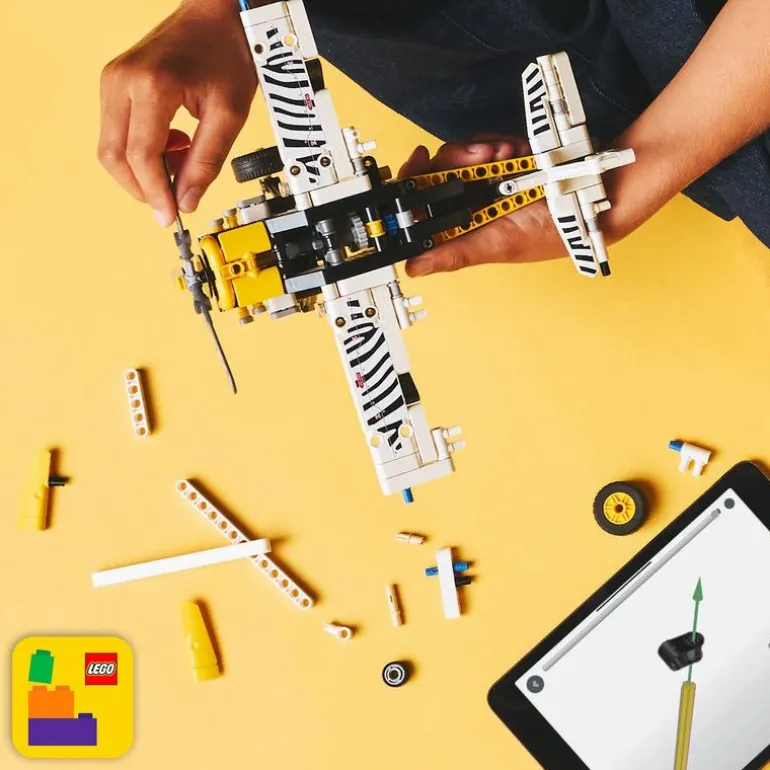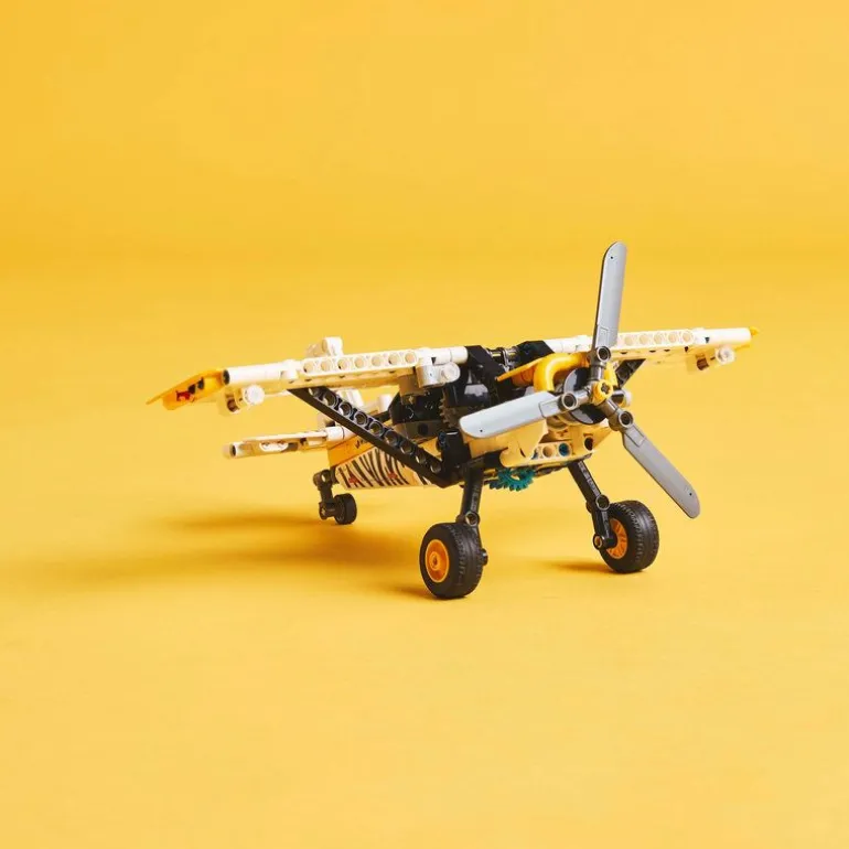 Ta til luften med LEGO Technic Villmarksfly. Skyv spaken for å starte den roterende propellen. Juster balanserorene på sidevingene og bakvingen for å justere høyden. Åpne motordekselet for å beundre den firesylindrede stempelmotoren. Nå er alt klart for takeoff!