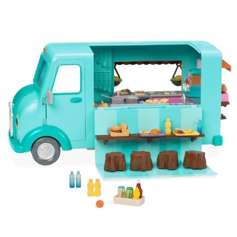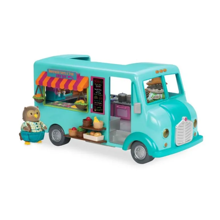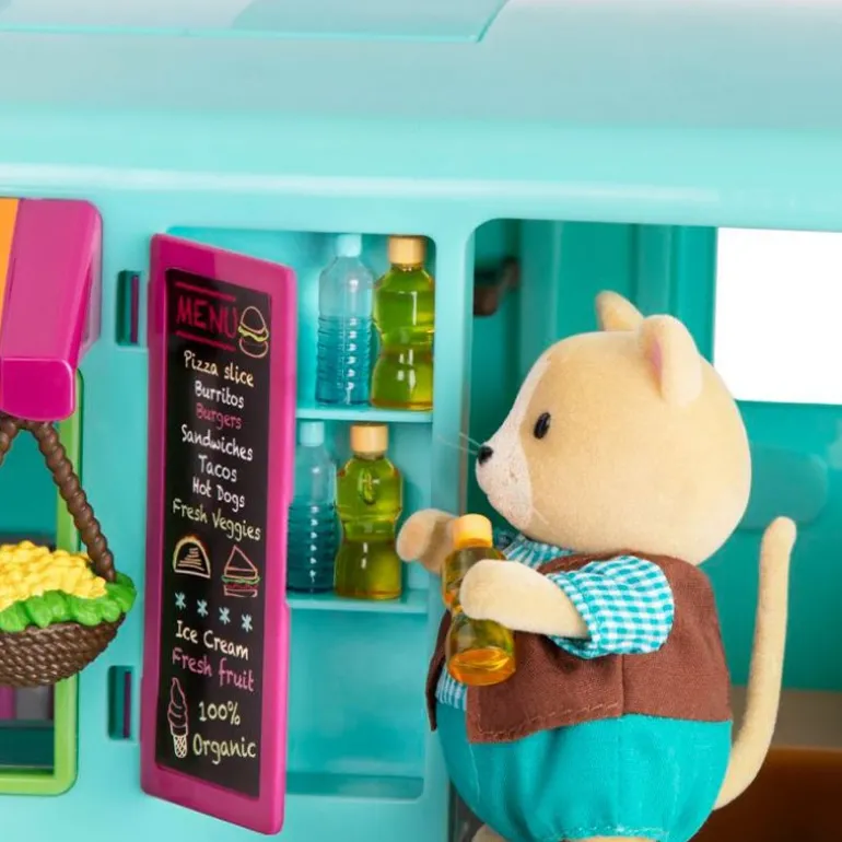 Hva er den deilige lukten som flyter på denne veien? Det er Honeysuckle Sweets & Treats gatekjøkken fra Li’l Woodzeez! Dette leketøykjøretøyet har mange godbiter for å de som er glad i noe søtt, med en iskremmaskin for å lage dine egne desserter! Sjokolade eller jordbær? Du bestemmer! Ikke bli mett på desserten – gatekjøkken har alle favorittmatbitene dine, inkludert pizza, burritos, burgere og pommes frites. Legg til litt sennep eller ketchup, og nyt maten! Honeysuckle Sweets & Treats gatekjøkken er det perfekte stedet å ta med dyrekarakterene dine når de føler seg sulten!