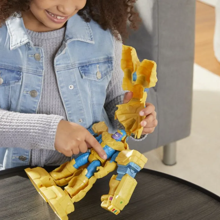 - Thanos bærer den siste Mech Strike-kamp rustningen og et våpen som barna kan snurre.