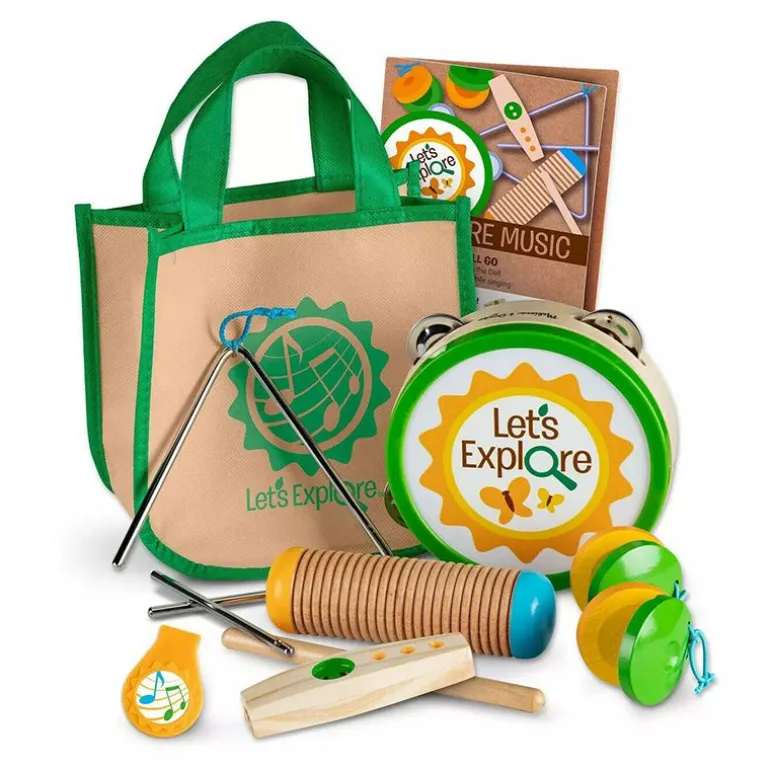 Utforsk utendørsopplevelsen med å lage musikk rundt et ekte eller late som bål med det 10-delte Melissa & Doug Camp Muiskk settet! Rist, skrap, klapp, nynne og ring disse holdbare tre- og metallinstrumentene, inkludert guiro og skrape, kastanetter, kazoo, trekantinstrument og hammerinstrument og tamburin. Pakk sangboken og instrumentene i den praktiske vesken for å ta det med for å lage musikk på veien! Let’s Explore serien oppfordrer barn til å koble seg til den naturlige verden gjennom fantasifull lek! Oppdag gleden ved utendørsopplevelser som gir nysgjerrighet og selvtillit mens det inspirerer barna til å si «La oss utforske»!