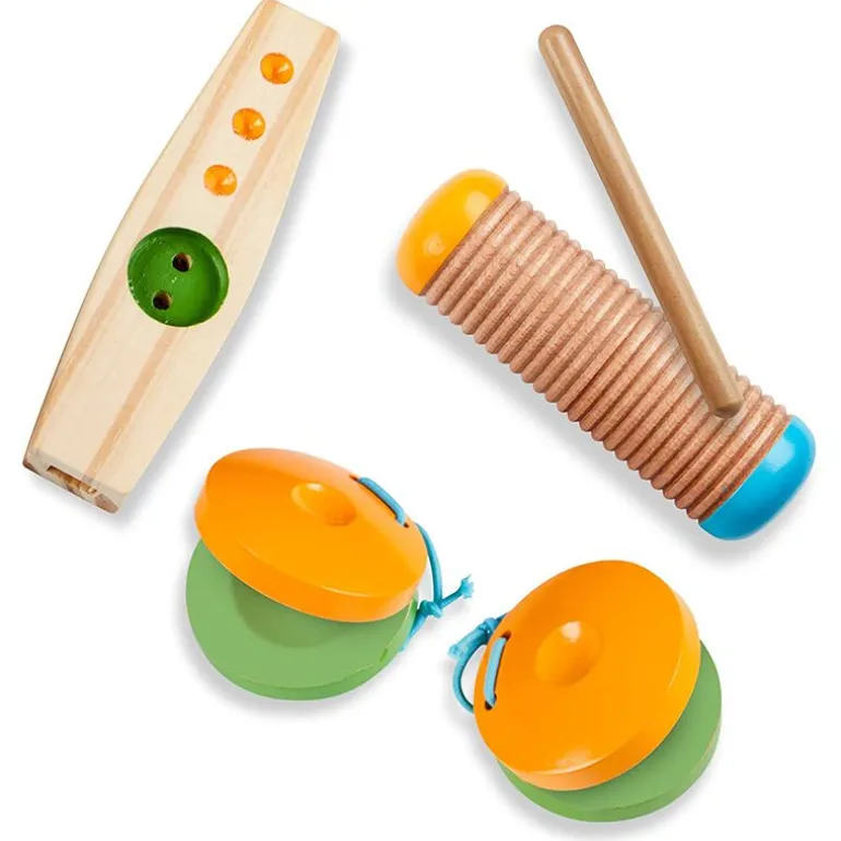 - Inkluderer guiro og skrape av tre og metall, kastanetter, kazoo, trekant og hammer-instrument, tamburin og mer