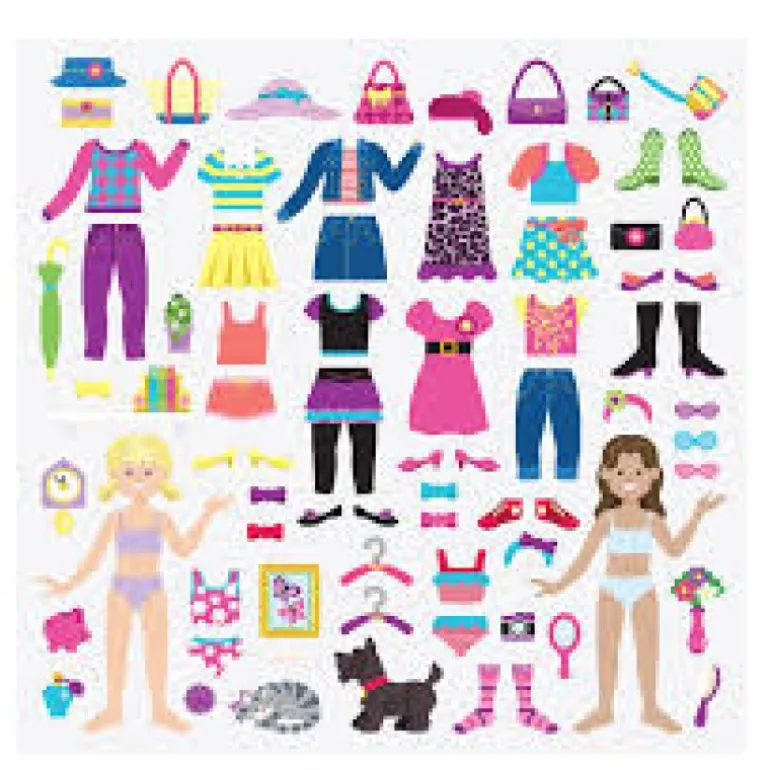 76 morsomme puffy gjenbruks klister. Her kan barna bruke fantasien og kreativiteten sin i påkledning av disse dukkene med klistremerker. Barna kan kle av og på så mange ganger de ønsker. Godt for finmotorikk, hånd/øye kontakt, kreativitet og rollelek.