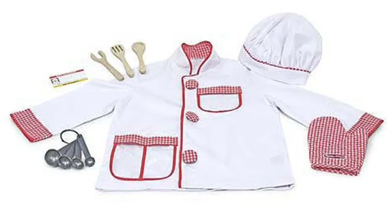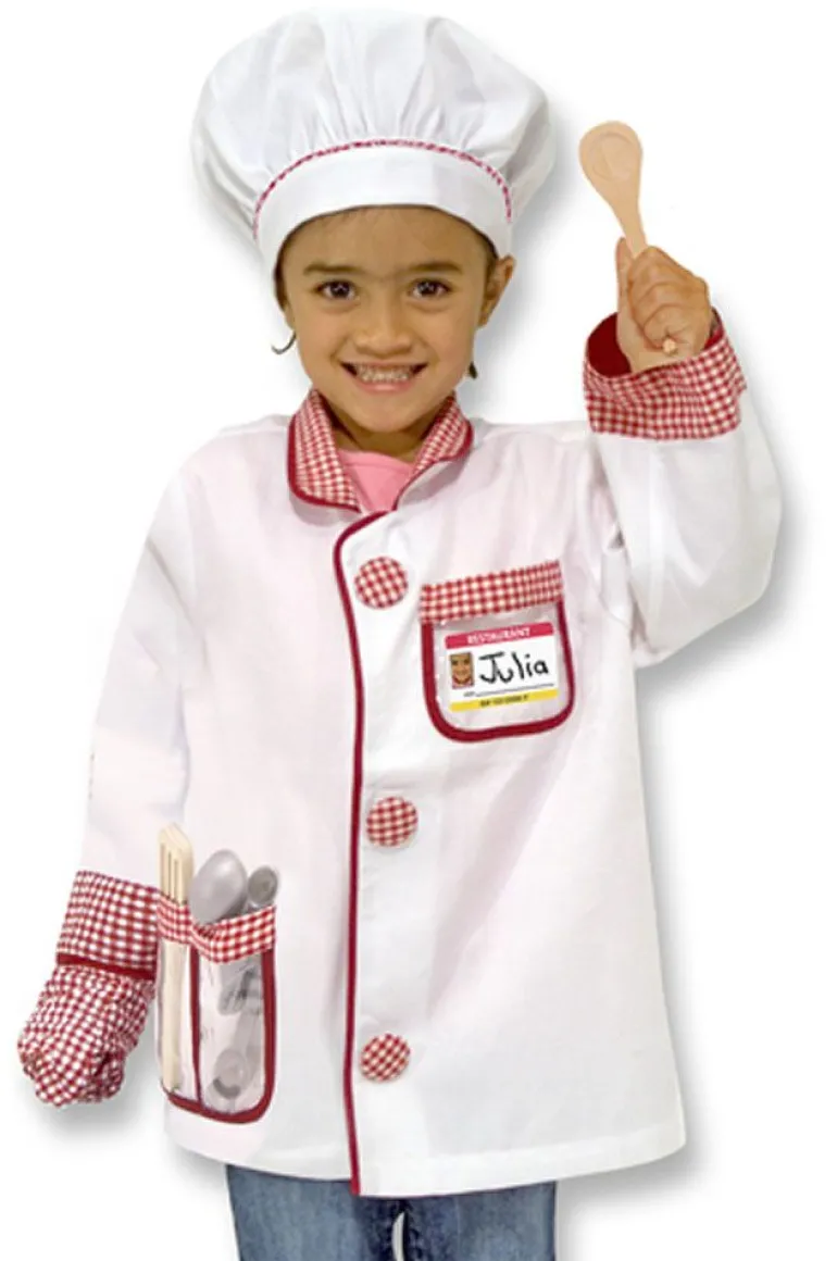 Små kokker trenger rett utstyr og med dette gøyale kokkekostymet kommer barnet i rolle. Kostymet bestående av hatt, grytevott og jakke med lommer som har plass til tresleiver og utstyr gjør leken komplett. Passer for barn fra 3 – 6 år.