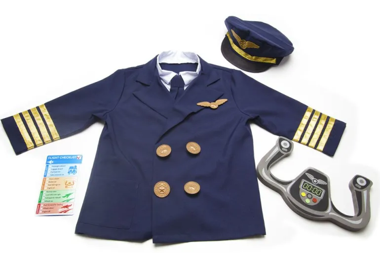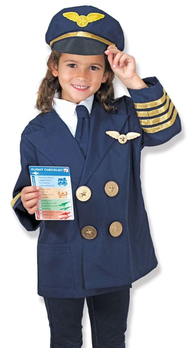 Små piloter kan leke at de flyr oppe i skyene i dette flotte pilot kostymet med tilbehør. Kostymet består av overdel, hatt, styre og fly sjekkliste så piloten er klar for nye eventyr i lufta.