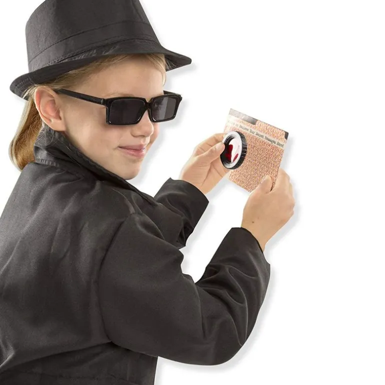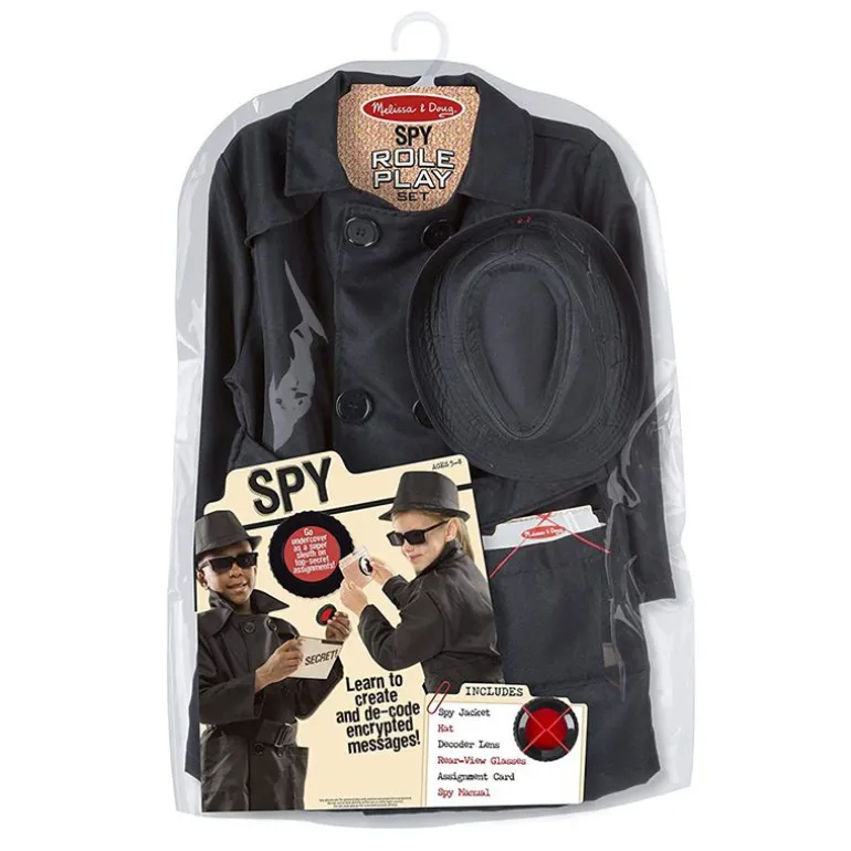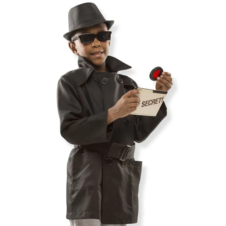Stilig og realistisk spion kostyme for barn i alderen 4-6 år. Settet inkluderer: sort jakke, hatt, briller og et kort med hemmelige koder inni. Kostymet inviterer til morsom rollelek.
