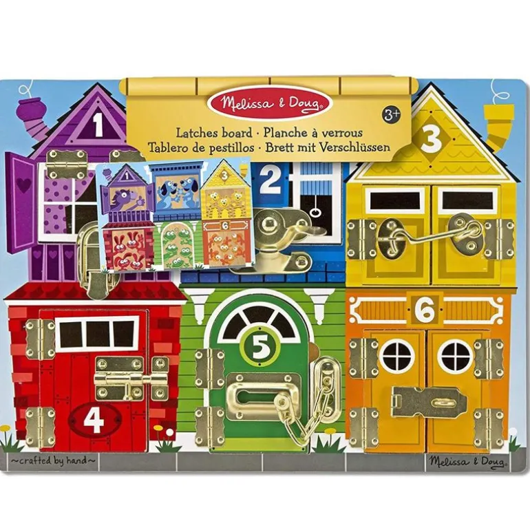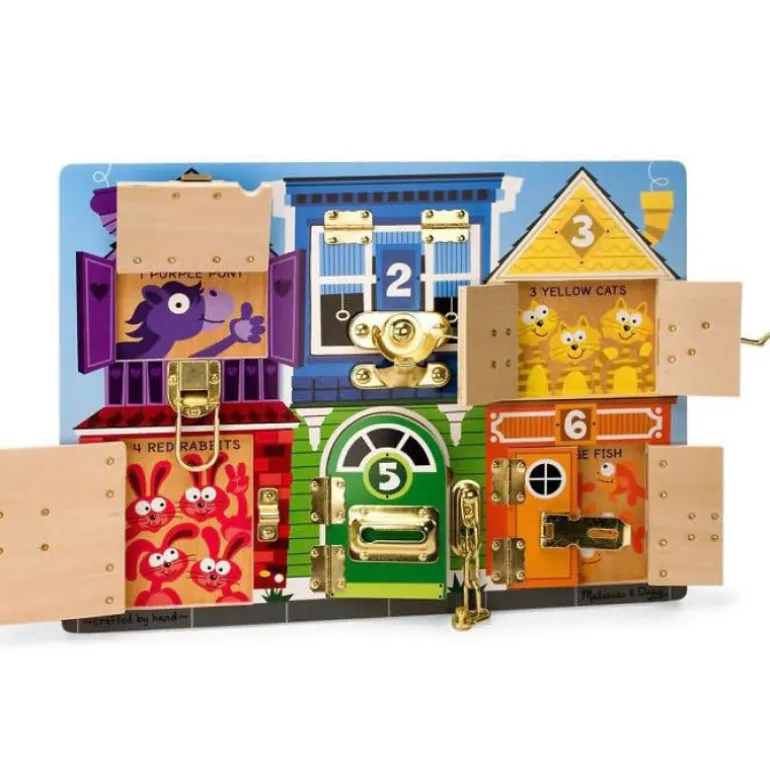 Lås opp, vri og vipp opp lukene for å se hva som gjemmer seg bak dem. Med dette gøyale brettet kan barna lære om farger, tall, dyr og former mens de samtidig utvikler finmotoriske evner og har det morsomt!