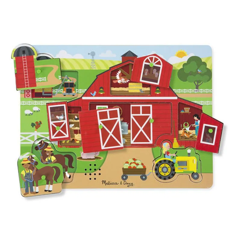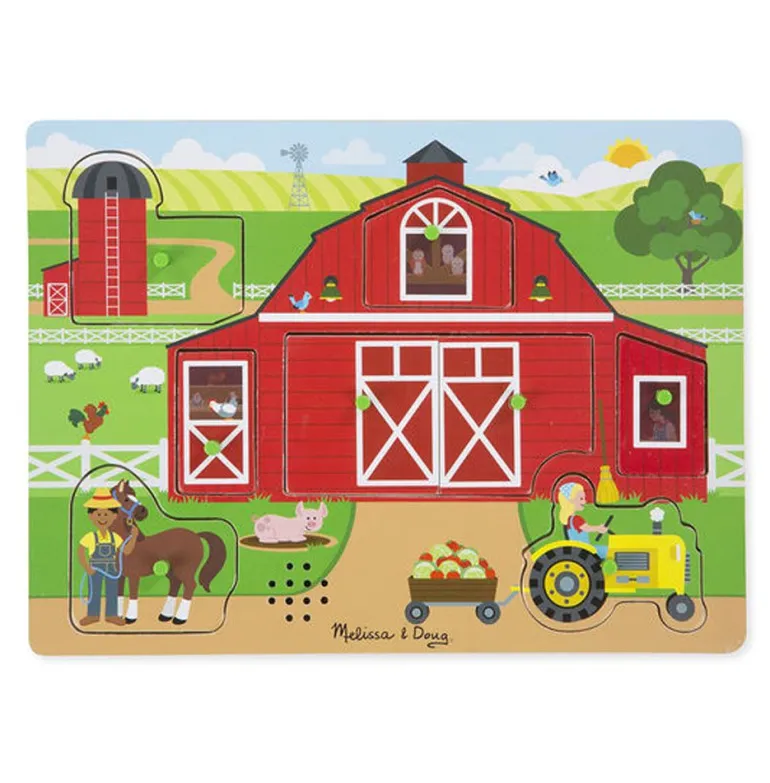 Gårdspuslespill med lyd fra Melissa & Doug. Når en løfter en bit spilles det av lyd for den biten. Puslespillet har 8 bitert med gripehåndtak, og passer fra 2 år+