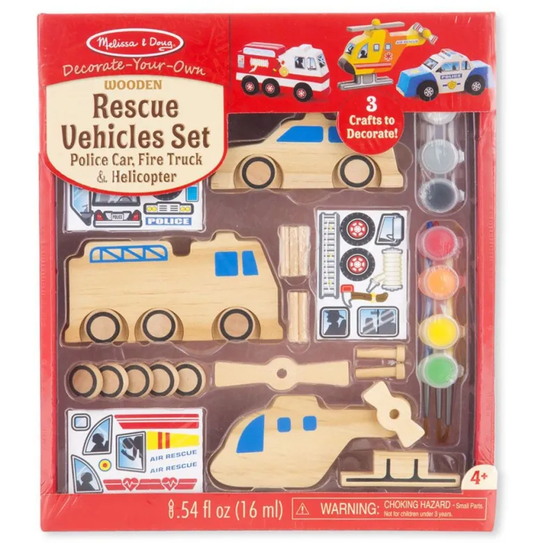Spennende redningskjøretøy sett med tre redningsbiler fra Melissa & Doug. Hjul og propeller kan spinne! Settet er lett og montere og inneholder politibil, brannbil og helikopter i tre, hjul, aksler, propellere og stativ, pluss 8 potter med maling, 3 pensler, lim og mange tema klistremerker for å fullføre utseendet. Barna kan dekorere og vise dem alle eller lage dem sammen med venner – en morsom aktivitet.