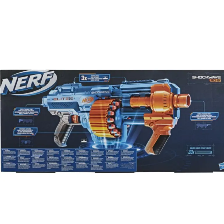Nerf Elite 2.0 Shockwave RD-15-blasteren kommer med funksjoner du kan egendefinere, inkludert 3 taktiske skinner, festepunkt for geværløp og festepunkt for skjefte, slik at du kan være best mulig forberedt. Denne blasteren har en pumpefunksjon og et rundmagasin som rommer 15 piler, slik at du kan fyre løs på motstanderne. Trekk tilbake pumpebryteren og trykk på avtrekkeren for å skyte én pil, eller hold inne avtrekkeren og beveg bryteren for å skyte alle 15 pilene raskt etter hverandre.