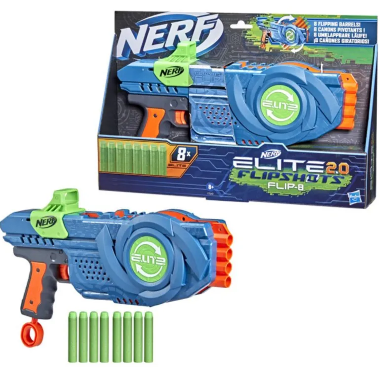 - Inkludert: Nerf Elite 2.0 Flipshot Flip 8 blaster og 8 offisielle Nerf Elite 2.0 skumpiler.