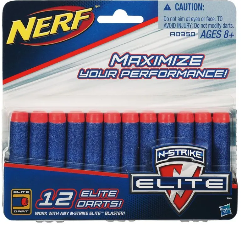 Refill sett med 12 elite dart piler til Nerf lekevåpen. Pilene er av skumgummi med plast-tupp og passer til de fleste Nerf N’strike blastere.
