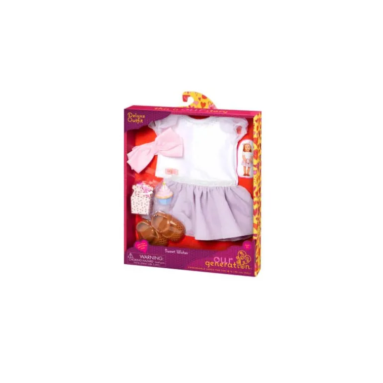 Feir din 46 cm dukkes spesielle dag på en morsom måte med Our Generation Sweet Wishes-antrekket! Med en søt og uformell topp med capsermer og fargerike strø på kragen, et plissert lilla skjørt og et stort knallrosa pannebånd, vil dukkebestien din se søt ut som en cupcake når festlighetene begynner!