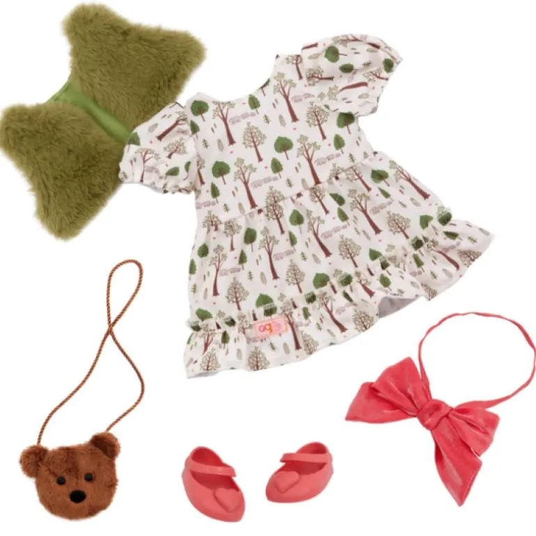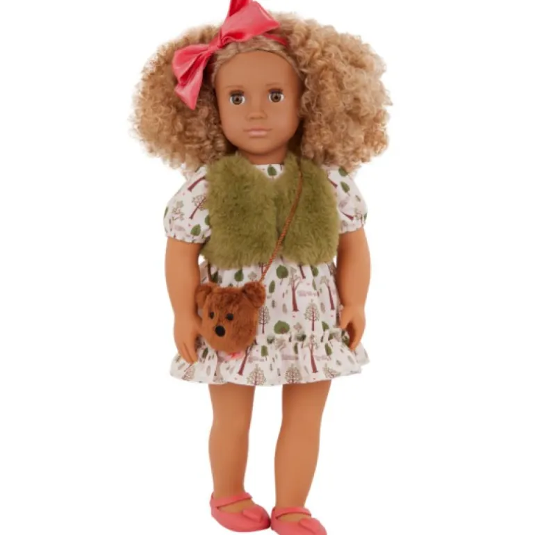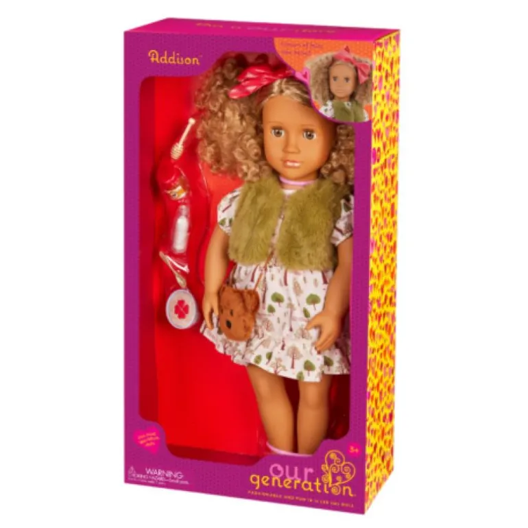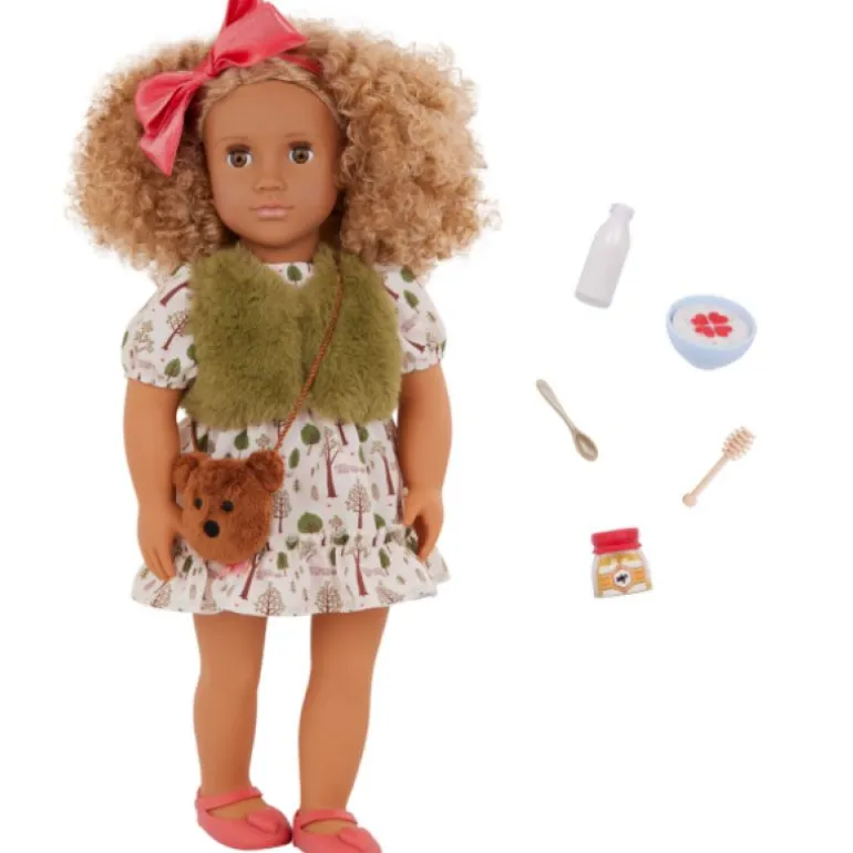 Drøm opp eventyrmoro med Addison! Denne Our Generation 46 cm dukken kommer med mote og stil inspirert av «Gullhår»! Hun har på seg en kjole med skogtrykk og en fuskepelsvest komplett med et sløyfebånd og en søt bjørneveske. I tillegg kommer hun med tilbehør på temaet som en bolle med grøt som er akkurat passe, en flaske melk, en krukke med honning og en honningbolle slik at barna kan hoppe inn i mange nye eventyr!