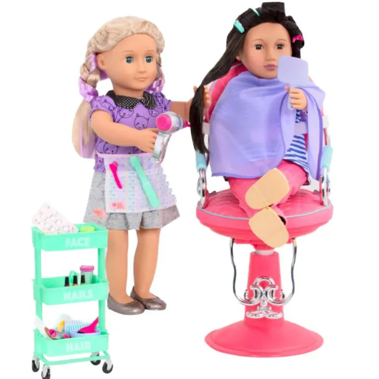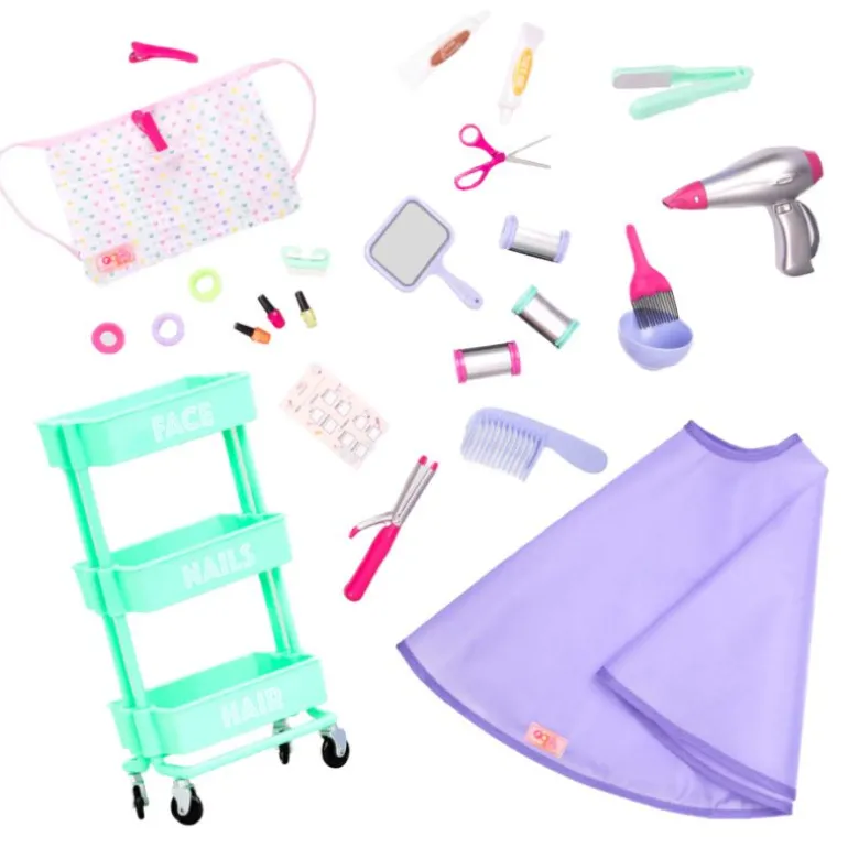 Dette salong tilbehørsettet for dukker er det perfekte tillegget til enhver dukke-frisørsalong. Hvilken dukke er stylisten og hvilken er kunden i dag? Beskytt dukkens klær med den lilla kappen. Frisøren kan bruke forkleet for å holde redskapene innen rekkevidde. Hårføneren lager realistiske lyder for enda mer moro! Bruk 3-lags vognen til å holde utvalget av hårspenner, krøllruller, hårfargestrimler og annet salongtilbehør – det er så mange av dem! Bare husk – den beste formen for styling er imaginær!
