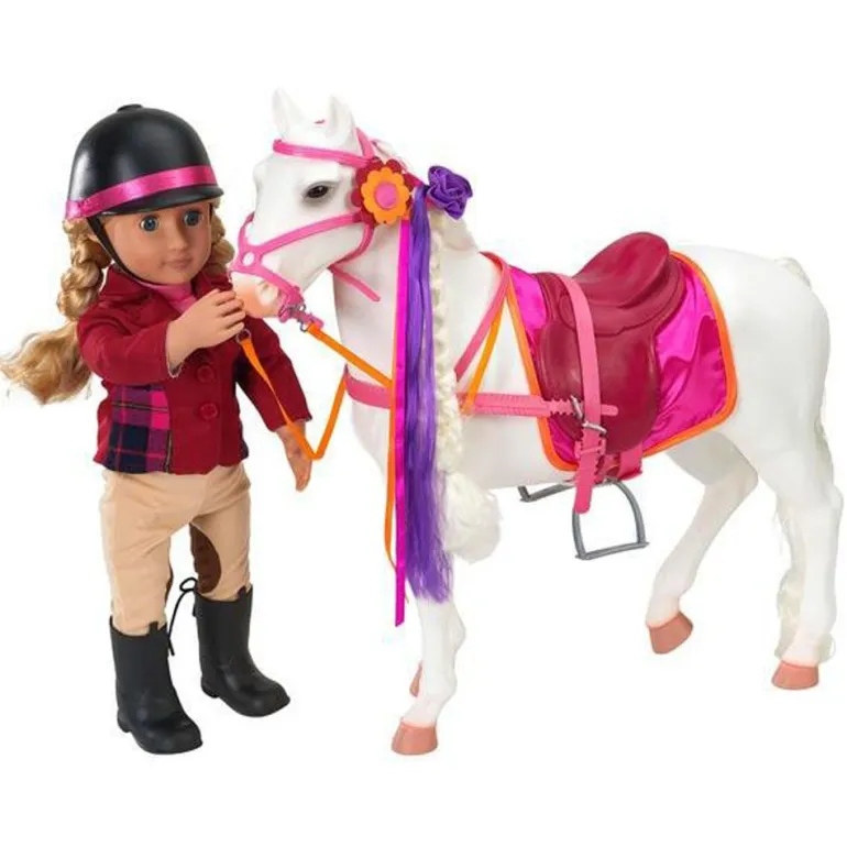 Møt denne flotte hesten som dine Our Generation dukker kan ri på. Hesten har bevegelige bein, og lang man som du kan gre. Med i settet følger masse tilbehør som kan brukes til å stelle og pynte hesten som farget bånd, rosa og lilla striper til manen og klemmer. Hesten er 49 cm høy, og ca 48 cm lang. Dukke, hestehenger m.m. selges seperat.Passer fra 3 år+N
