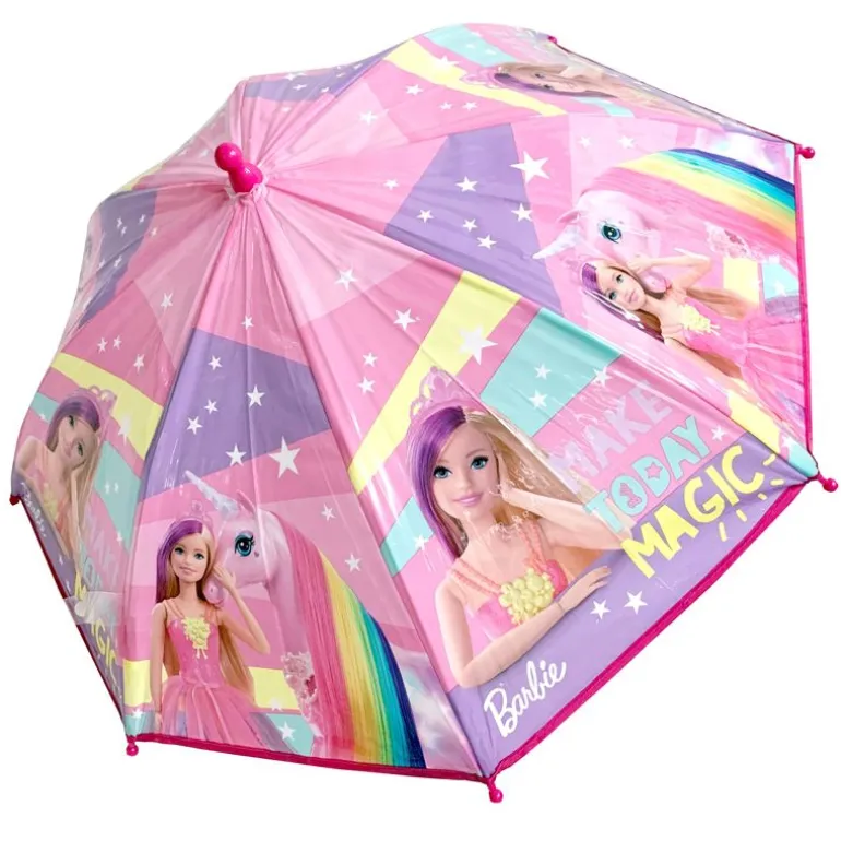 Gi barna glede selv på regnværsdager med denne sjarmerende Barbie paraplyen! Paraplyen kommer med et stilig og fargerikt design inspirert fra Barbie’s univers! Paraplyen har et solid håndtak som er designet for å gi barna et godt og behagelig grep.
