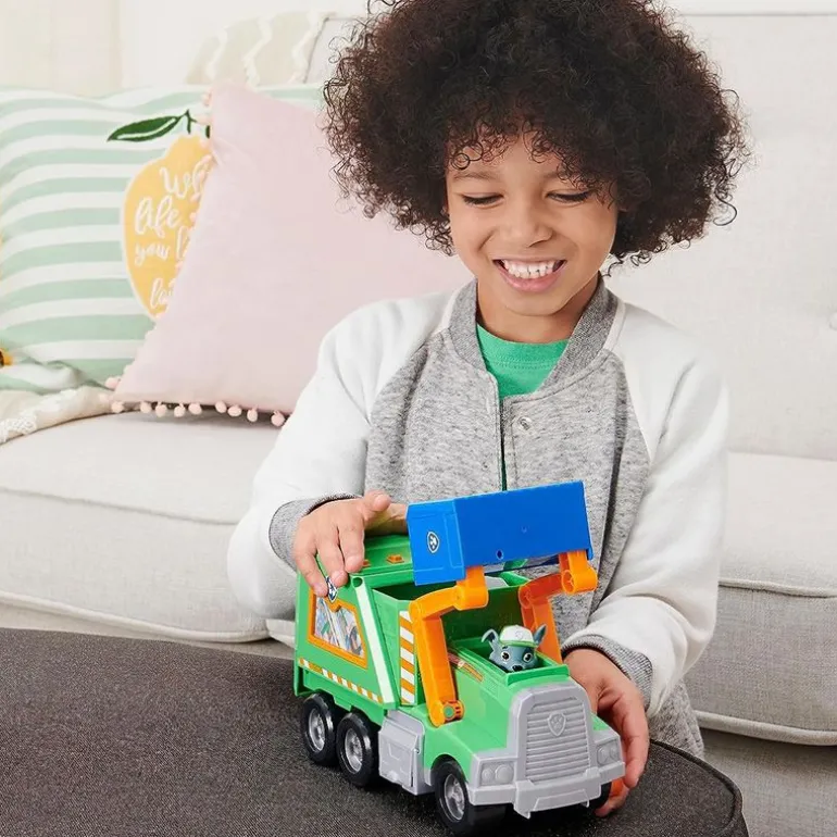 Ikke mist det, bruk det på nytt. Med Paw Patrol’s Rocky og hans re-use-it søppelbil kan du resirkulere materialer og gjøre dem om til verktøy som hjelper deg med å redde dagen. Utstyrt med rullende hjul og bevegelige armer, gjør Rocky’s søppelbil det enkelt å spille ut oppdragene dine. Plasser Rocky bak rattet og bruk fantasien til å rulle gjennom gatene i Adventure Bay og se etter gjenstander å resirkulere. Skyv søppelbøtta over armene på lastebilen og løft den opp med metallkubene (to inkludert) og gjør deg klar til å gjøre dem om til noe nytt. Skyv spaken på lastebilen ned for å få armene til å løfte seg og se når søppelbøtta tømmer kubene i Rockys lastebil, akkurat som en ekte søppelbil. Deretter skyver du knotten på siden av bilen og får en sniktitt på komprimatoren gjennom sidevinduet. Når lastebilen er ferdig å resirkulere, forvandles metallkubene dine til tre praktiske verktøy som enkelt kan festes på lastebilens armer. Fjern søppelbøtta og bland og match opptil to verktøy om gangen. Bruk børsten til å feie gatene, plukk søppel med kloen og utføre reparasjoner med hammeren. I tillegg kan du til og med rotere armene for å få enda flere måter å leke på. Når du er ferdig med oppdraget, løfter du toppen av lastebilen for å oppbevare verktøy og metallkuber inni. Slå deg sammen med resten av valpene og redningskjøretøyene deres (hver selges separat) for flere Paw Patrol-opplevelser.