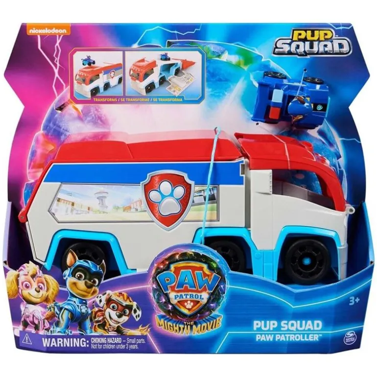 Gjør deg klar til ditt neste store redningsoppdrag med Pup Squad patruljebilene, Mighty Pups Chase og Pup Squad Racer akkurat som du ser i filmen PAW Patrol: The Mighty Movie! Dette kjøretøylekesettet er 25,4 cm langt og 12,7 cm høyt og har en spennende transformasjon fra en PAW Patroller-lekebil til et fantastisk mobilt kommandosenter, komplett med utskytningsrampe og leketøysoppbevaringsplass, for plass til flere Pup Squad-racerbiler (selges hver for seg).