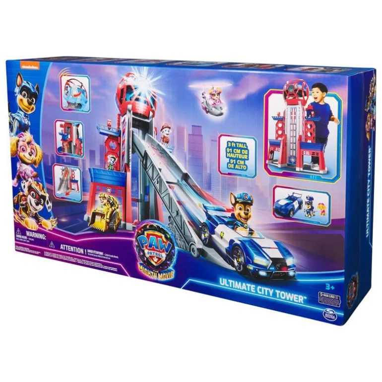 Vi presenterer den splitter nye PAW Patrol: The Movie Ultimate City Tower. Dette 91 cm høye lekesettet – det høyeste PAW Patrol-tårnet til nå – bringer valpenes Adventure City-hovedkvarter til live. Den er fullpakket med fantastiske funksjoner, inkludert en transformerende opplyst redningsrampe, kommandosenter, kjøretøyløft, valpeheis, lys og lyder, og mye mer.