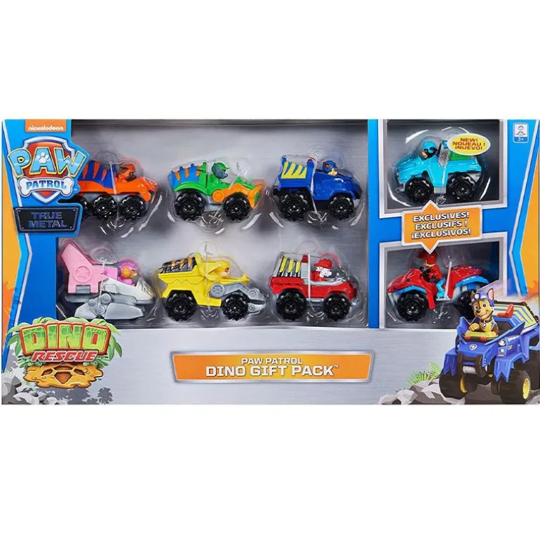 - Inkludert: Chase, Rocky, Rubble, Ryder, Rex, Marshall, Skye, og Zuma Dino Rescue kjøretøy med støpt figur, og samleplakat