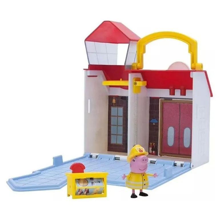 Sammen med Mamma Gris, er lille Peppa klar til å dra ut på redningsoppdrag med dette stilige brannstasjon lekesettet fra Peppa Gris! Telefonen ringer på stasjonen og Mamma Gris og Peppa er raske til å finne frem brannbilen før de kjører raskt av sted. Når de kommer fram til brannen setter de opp den roterende stigen og gjennomfører nokk et vellykket oppdrag. Tilbake på stasjonen setter Mamma Gris seg ved skrivebordet og lille Peppa tar heisen opp til utkikkstårnet for å holde et øye over byen.