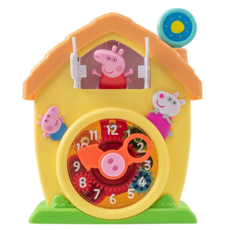 Denne stilige Peppa Gris læreklokken gjør det super enkelt for små barn fra 18 måneder og oppover som skal lære seg klokken! Hør klokken ringe når viseren står på 12 og se at Peppa Gris popper frem! Klokken vil «tikke» som et ekte gjøkur. Tannhjulene snur seg bak urskiven mens klokkeviserne beveger seg, og Georg og Suzy danser når hendene beveger seg. Pipen kommer med motiv av en sol på den ene siden og en måne på den andre siden for å indikere om det er dag eller natt. Klokken er formet for å gjenskape Peppa-huset fra showet og er perfekt for alle Peppa Gris-fans.