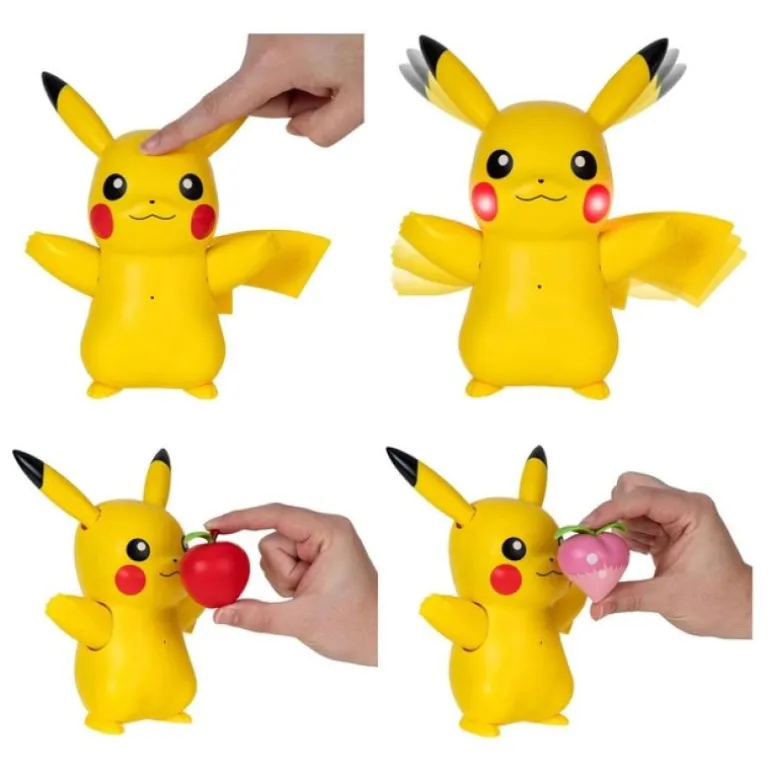 Bli kjent med Pokémon Train and Play Deluxe Pikachu! Denne interaktive, 11,5 cm figuren byr på over 50 unike reaksjoner, inkludert lyder, lysende kinn, og bevegelse i armer, ører og hale. Han kommer med to interaktive bær som utløser spesifikke reaksjoner når han holdes mot nesen, og du kan ta på hodet hans eller snakke direkte med ham for mer samtale. Inkluderer 3xAAA-batterier, som er sikret med et skrupanel på Pikachus rygg, og tilbyr tre moduser: PÅ, AV og PRØV MEG.