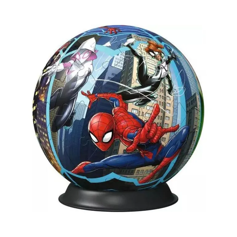 Stilig 3D puslespill i kuleform fra Ravensburger med Spider-Man motiv. Brikkene kommer med nummer på baksiden – pusle i stigende rekkefølge for å fullføre den flotte kulen og still den opp som dekor med sokkelen!