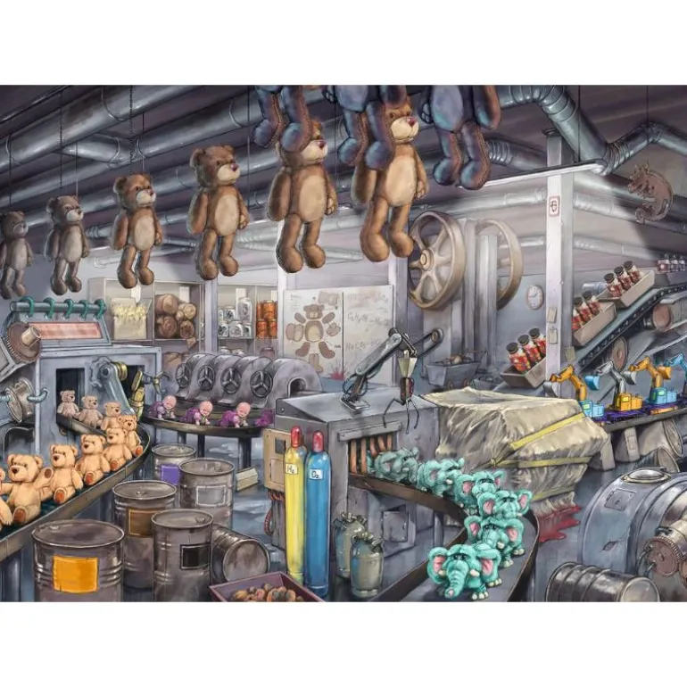 Leken er over! Det er på tide å stoppe produksjonen av skumle leker og unnslippe det skumle kaoset i «Leketøyfabrikken»-puslespillet – noe montering kreves!