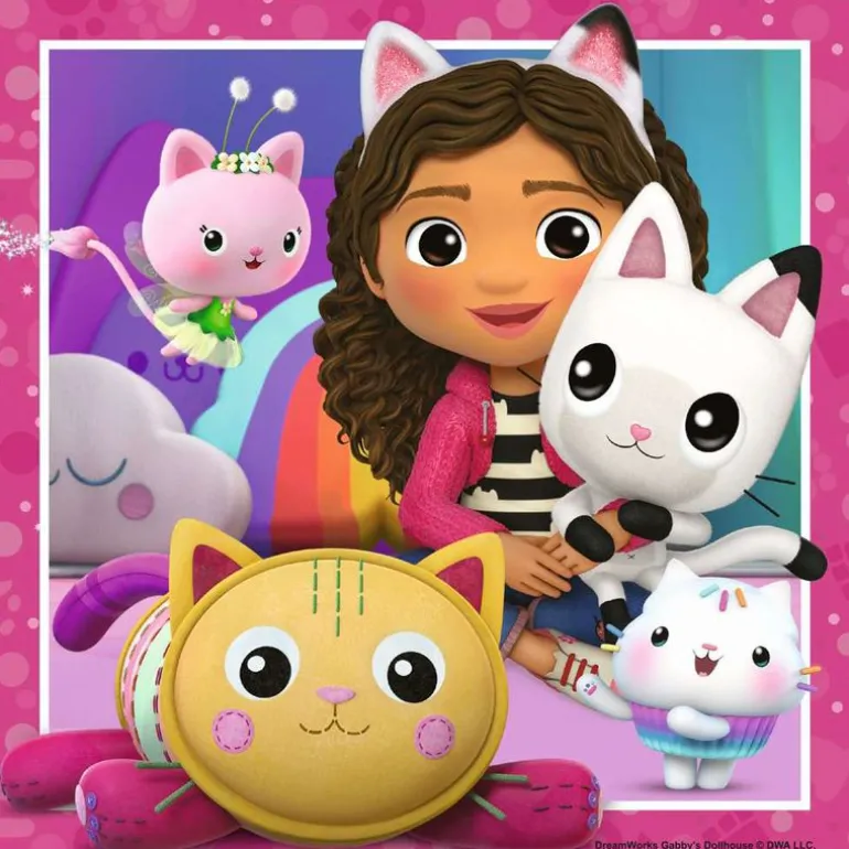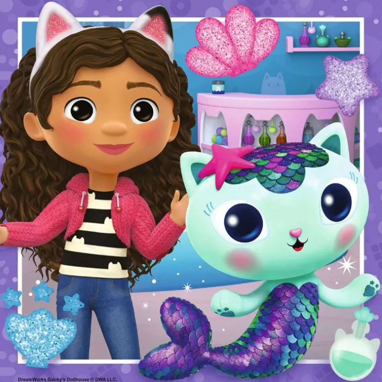 Disse tre puslespillene med 49 brikker av høy kvalitet tar deg med inn i den magiske verdenen til Gabby’s Dollhouse! Hvert puslespill besøker et annet rom i dukkehuset; bli med Mercat for litt super spa-vitenskap, besøk Garden Fairy for å utrette litt strålende hagemagi. Og til slutt, drøm det opp med Pillowcat for en magisk drømmeopplevelse! Disse lyse og livlige puslespillene må du ikke gå glipp av, spesielt Gabby’s Dollhouse-fans!